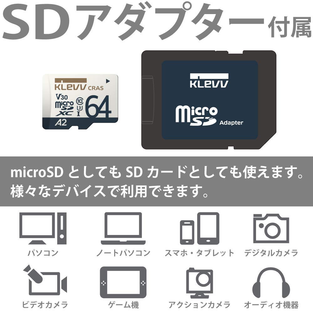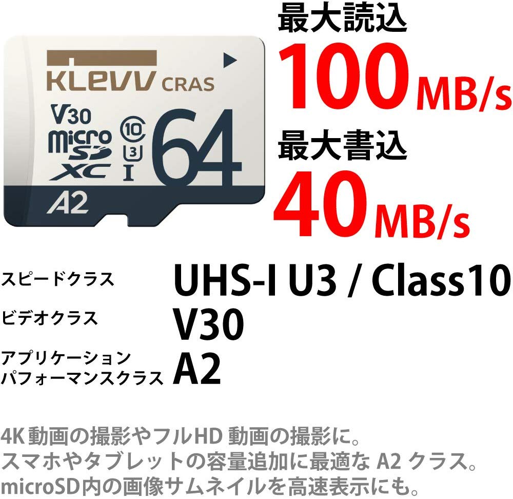 ESSENCROE KLEVV UHS-I U3 A2 microSD Memory Card CRASシリーズ UHSスピードクラス3 / ビデオスピードクラス V30 / アプリケーションパフォーマンスクラス2(A2)に対応した microSDXCカード 64GB Nintendo Switch 動作確認済み ■高速転送、「UHS-I U3」対応のmicroSDXCカード 高速SDインターフェース「UHS-I」の対応機器で使用すれば、最大読込速度100MB/s、最大書込速度40MB/s を実現します。